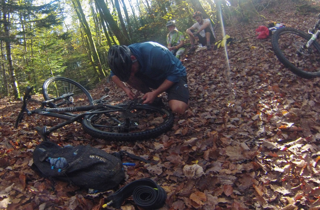 Tout se passe bien jusqu'au "crac" Cédric vient de casser sa patte de dérailleur, pas de rechange on est en pleine forêt.