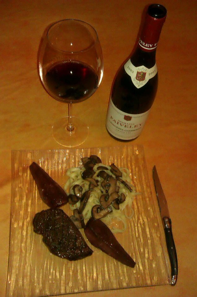 Filet de canette bio (viande carrément viscérale au goût de foie et de sang), poires au vin rouge, gingembre et baies roses... Nouilles bio exceptionnelles, champignons rosés des prés... Accords parfait avec ce Latricières-Chambertin 2003...