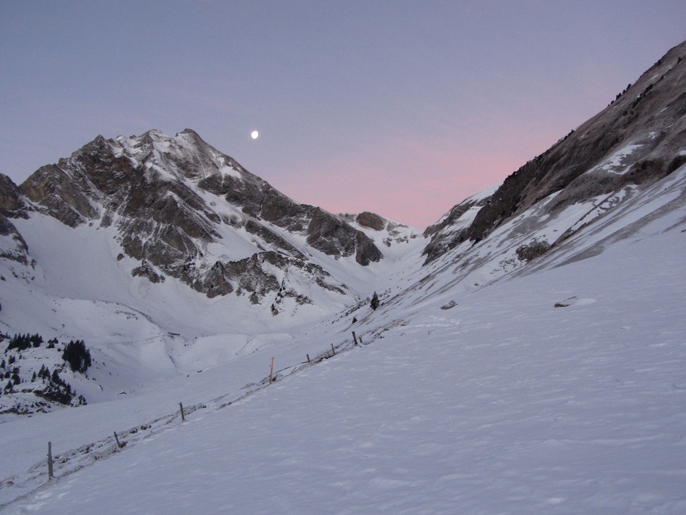 Le matin au départ de Gitschenen avec la lune et le Hoch Brisen en toile de fond : La remontée de la combe avec le soleil qui se lève : L'arrête finale, un poil tendue, parcourue à pied et deux jeunes Suisses Allemands bien motivés : Manu au sommet avec la mer de nuages sur le lac des 4 cantons et les Vosges à gauche de sa tête : Des passages pas dégeux à la descente : Manu montre aux Suisses que les Français tiennent sur les skis : Manu envoie...prudemment--> la neige est changeante et les requins pas loin : La combe prend le soleil, ça reste pas mauvais à l'ombre: Plutôt sympa comme coin...vous trouvez pas?