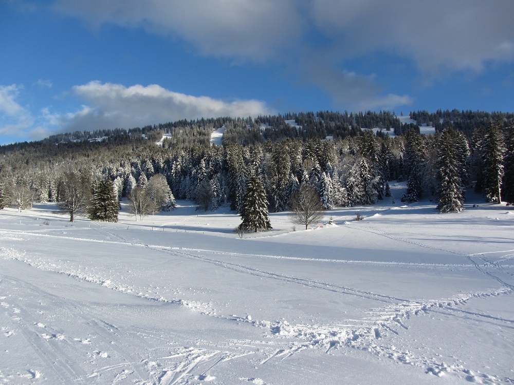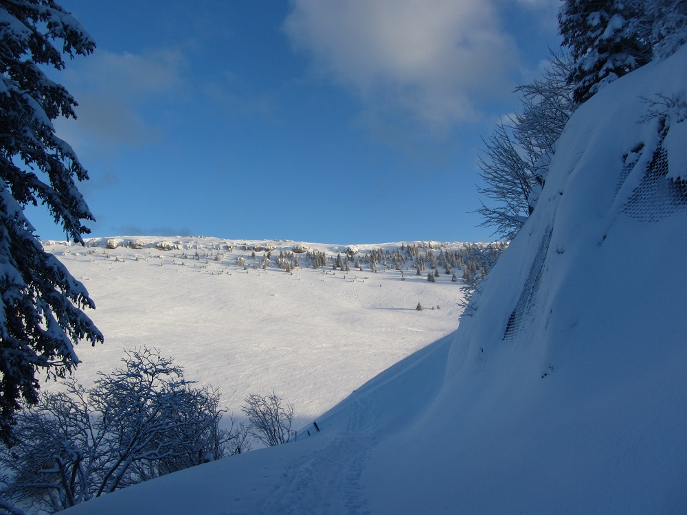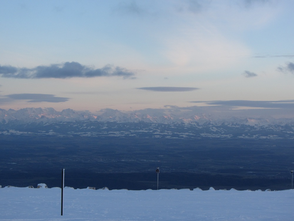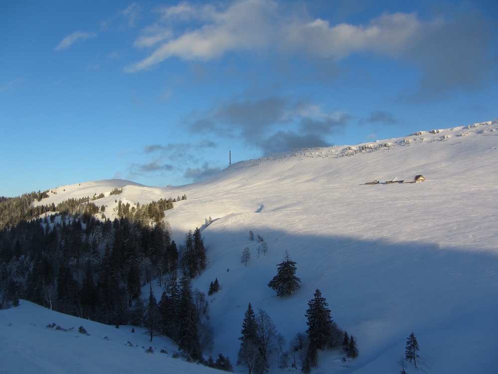 Arrivé aux Savagnières, pas doute c'est l'hiver et y'a du soleil : je commence à monter, il ne fait pas froid, pas des tonnes de neige, mais le fond est bien dur et y'a 15 à 20 centimètres de poudreuse dessus...ganz gut J'arrive à la métairies de l'Egasse apparemment ces cochons de Suisses ce sont fait plaisir : Arrivé au col entre la Cornette et L'Egasse c'est vraiment l'Hiver, difficile d'imaginer la route... Petit Chasseral, Antenne du Chasseral, métairie Saint-Jean : Arrivé au sommet du Chasseral, le couché de soleil est pas top...trop de nuages, les Alpes Bernoises avec en partant de la gauche : Bluemisalp, Doldenhorn, Balmhorn, Altels...le reste est caché: Petite redescente dans la combe, le vent de Sud d'ouest à ramener plein de neige, jusqu'à 50 cm de de poudreuse dense par endroit, avec mes gros skis je me fais plaisir (une constante ce WE