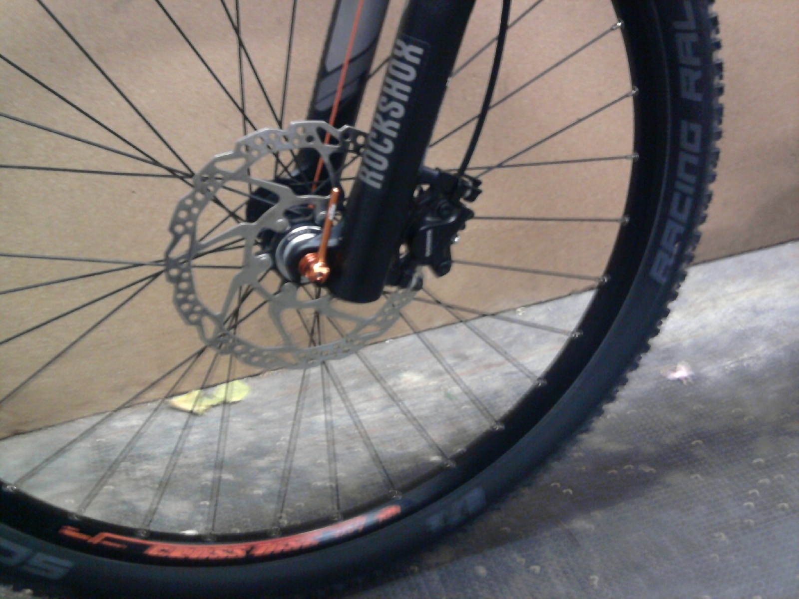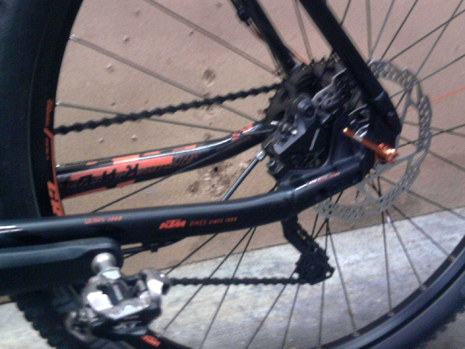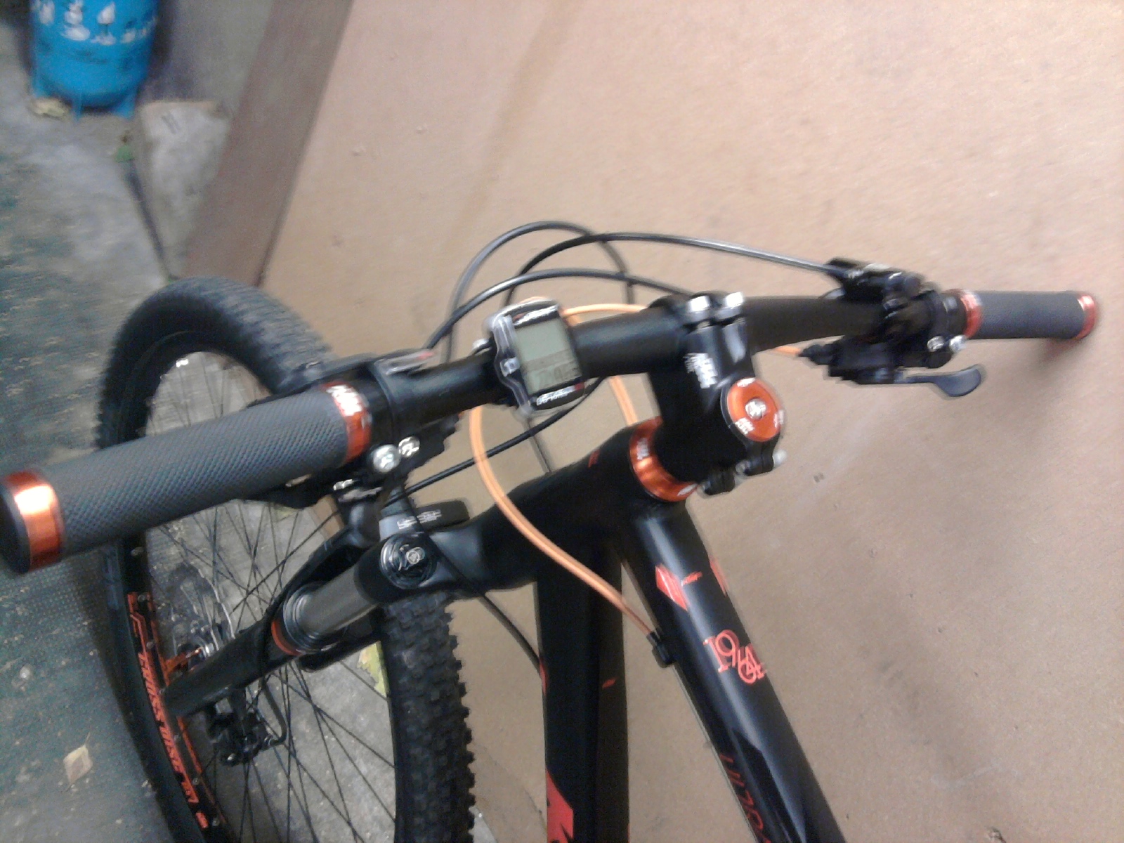 Un peu de quincaillerie d'accastillage orange, des grips ktm, bouchon orange sur potence downhill, blocages rapides oranges... Une superposition d'autocollants ktm pour un patchwork protège base...