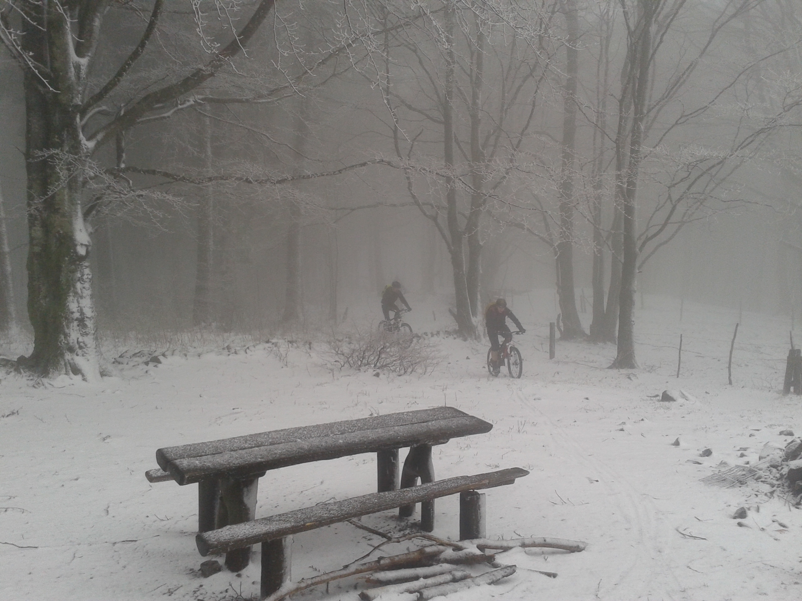 Monsieur+ nous a fait faire un tour super sympa: racines, feuilles mouillées, cailloux trempés, neige, pluie, montées piquantes et de belles descentes. Malgré tout çà, nous sommes tous rentrés sains et saufs. N'étant pas du coin, je laisse les spécialistes donner les détails du parcours.