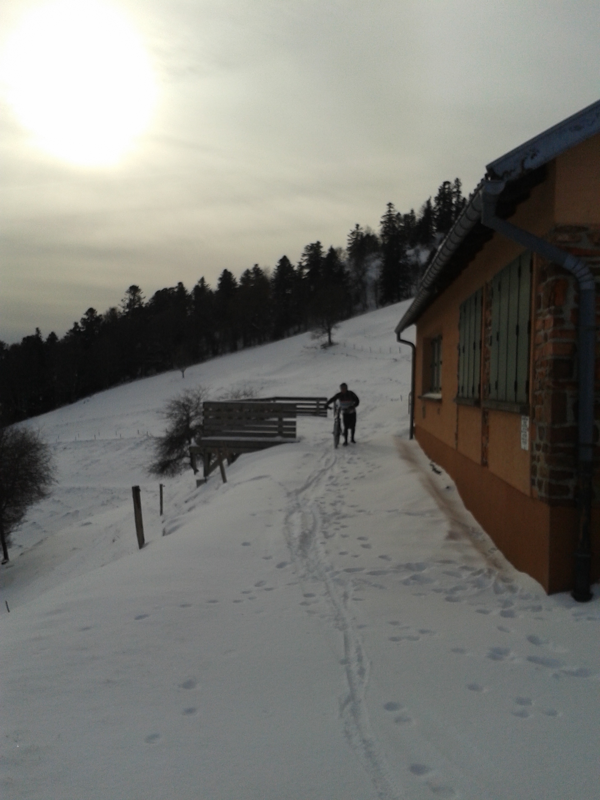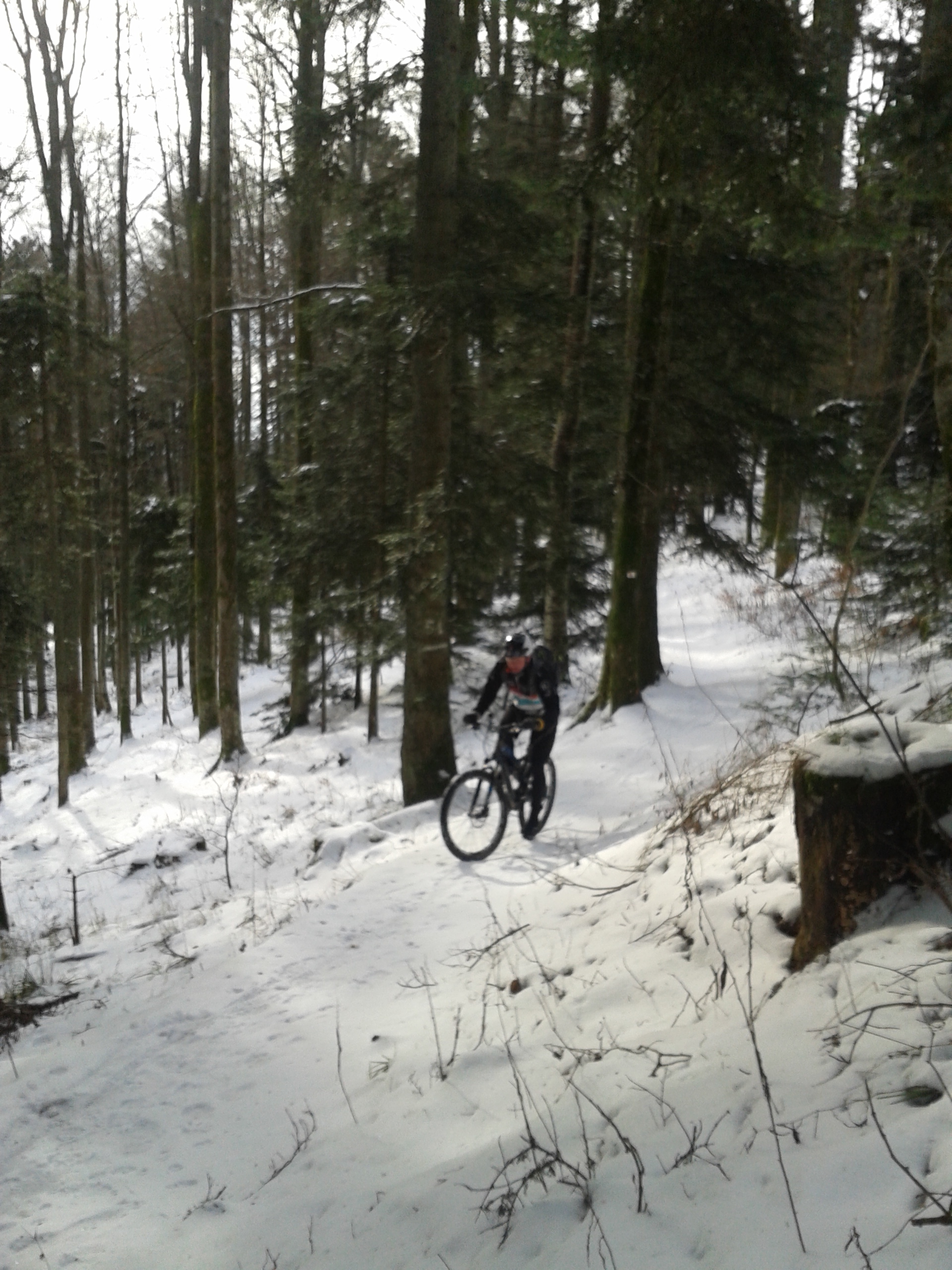 Staufen, Diebolt, Hundsruck, on prend le sentier audessus de la fourmie et arrivé au croisement un peu plus loin, on décide de prendre le sentier qui mène à la ferme du Thannerhübel, celui plein de caillasse plutôt qu'au Rossberg, histoire de gagner du temps . Nous avons rapidement eu de la neige (500m) mais c'était léger et souvent la neige était bien dur, bien tassée donc ça ne dérangeait pas du tout pour rouler . A partir de 900m là c'était autre chose, faut un peu forcer sur les jambes pour pédaler mais ça passe à part sur quelques raidillons .