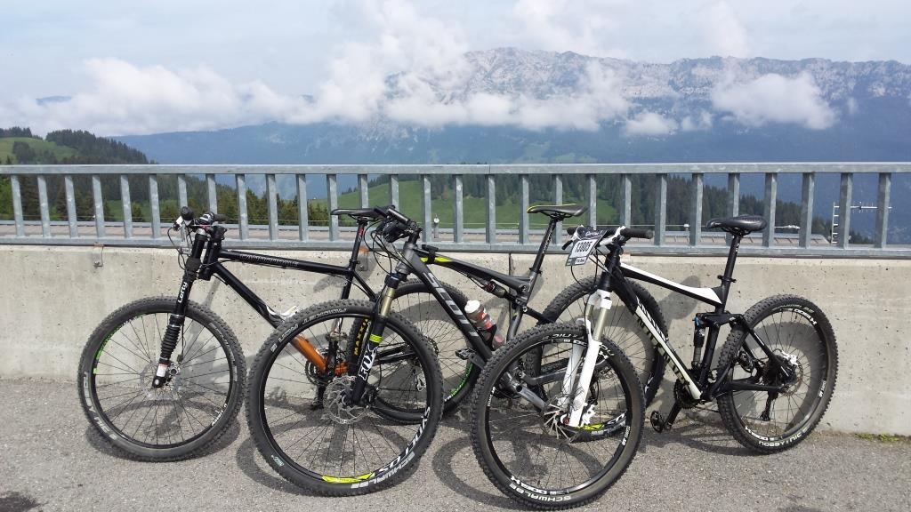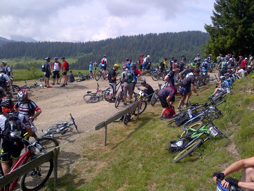 Un parcours à couper le souffle par la profondeur de champs de la plupart des points de vue avec les montagnes encore enneigées sur les sommets comme image de fond. Une très grande majorité de singles, qui ressemblent surtout aux grands départ en vacances du mois d’août dans les premiers kilomètres. Un peu frustrant parfois de devoir poser le pieds dans des secteurs sans réelles difficultés… mais bon on s’y attendait un peu. Alternance de racines (beaucoup, beaucoup en début de parcours), de chemins pierreux, et de singles d’alpages avec quelques vaches à éviter, plantées au milieu des trajectoires !!! Pas mal de ravitos pour un parcours de moins de 50 bornes (5 ou 6 je crois), avec le premier et le dernier ou on a pu se faire plaisir avec du saucisson et du reblochon.
