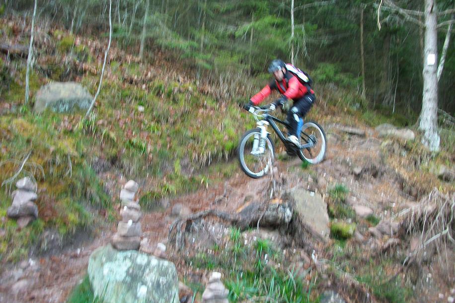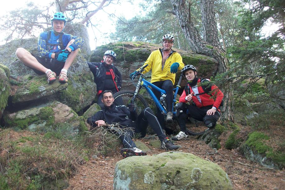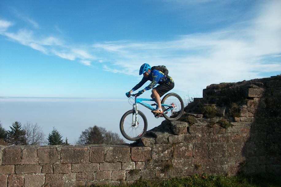 Pierrehins, Denis, Fredzy et Jérome, l'invité surprise ont répondu présent malgré le froid humide des premières heures. Direct on a débuté l'ascension de Zim au grand Honnack, tantôt par du sentier, tantôt par du chemin, jusqu'à sortir de cette brume tenace au niveau de la Croix de Whir. On a tourné un peu la haut avant de descendre sur le petit Honnach et proffité de la vue du château et de ces ruines. Superbe séances de free ride de la part de Pierrehins ou l'on a même eu droit à une belle cabriole sans gravité heureusement! Un fait marquant également, une horde de sangliers et marcassins qui nous on déboulé à 2m devant nous :| ....