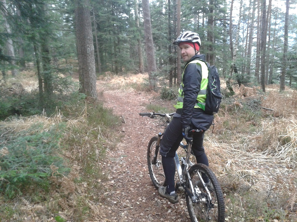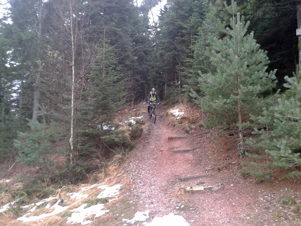 Votre serviteur dans la descente sur Foucharupt, de la caillasse, des dalles, des racines, qqes épingles, du placement pour faire passer le cintre entre les pins...que du bon sur à peine 300 m de D- :